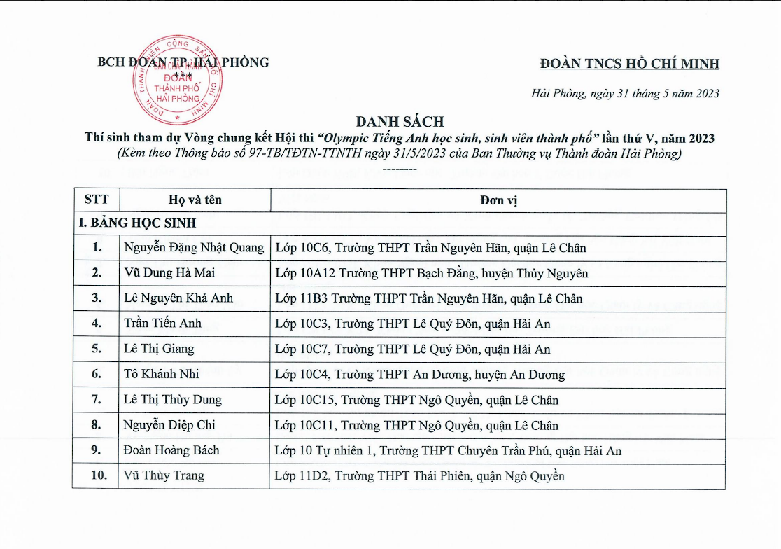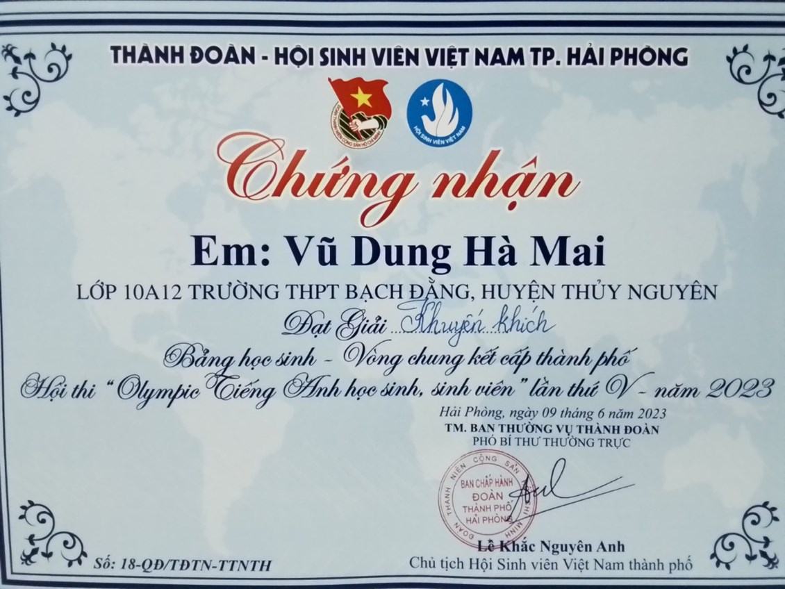 Hưởng ứng Kế hoạch số 69-KH/TĐTN-TTNTH của Ban Thường vụ Thành đoàn, tuổi trẻ Bạch Đằng đã tích cực tham gia "Hội thi olympic tiếng anh học sinh - sinh viên toàn quốc 2023" lần thứ V qua hình thức trực tuyến trên website. Qua 1 tháng tham gia dự thi và bạn Vũ Dung Hà Mai lớp 10A12 trường THPT Bạch Đằng đã đạt thành tích đáng ngưỡng mộ, được Ban Giám Khảo lựa chọn tham gia vòng Chung kết Thành phố. Đồng hành trên hành trình tham gia dự thi của cô học sinh tài năng này là gia đình, người cô và những người bạn thân thiết của bạn.