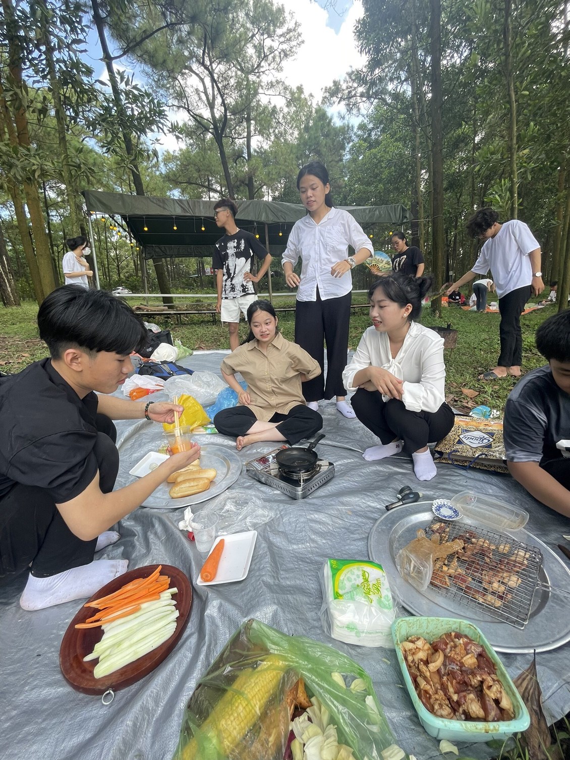 Đội 1 chuẩn bị món thịt nướng và bánh mì nướng muối ớt.
