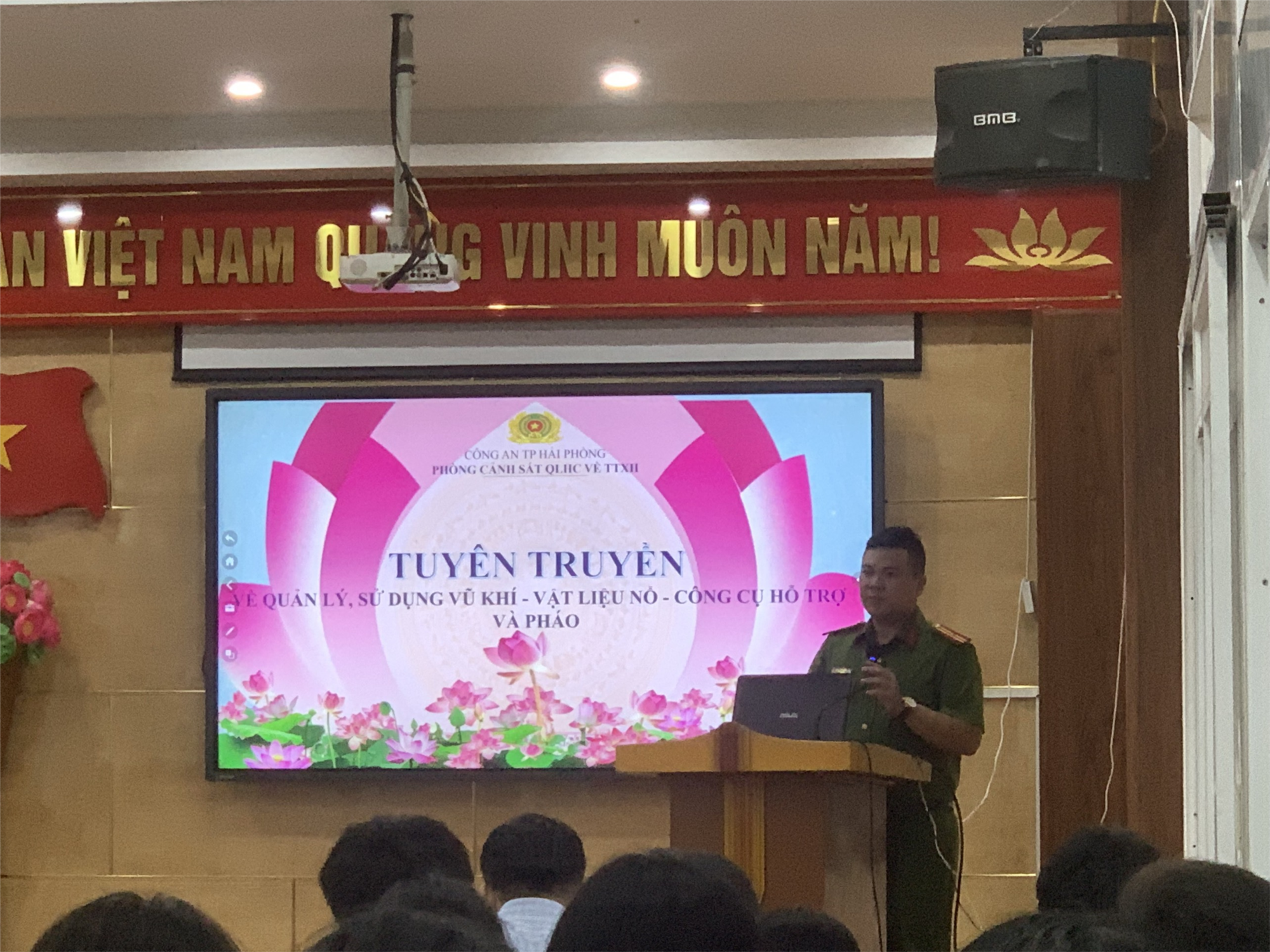 Tại buổi tuyên truyền, Cán bộ giáo viên và học sinh đại diện các lớp đã được nghe Thiếu tá Vũ Hoàng Anh - Đội trưởng phòng quản lí trật tự xã hội, Công an thành phố Hải Phòng tuyên truyền viên từ Phòng quản lí trật tự xã hội, Công an thành phố tuyên truyền, phổ biến một số nội dung cơ bản của Luật quản lí, sử dụng vũ khí, vật liệu nổ, công cụ hỗ trợ và pháo; Nghị định 37 của Chính phủ về quản lí, sử dụng pháo. Ngoài những hình ảnh, ví dụ đa dạng cùng các bài phóng sự, cac đ/c từ Phòng quản lí trật tự xã hội còn chia sẻ về những lần xử lí những vụ tai nạn thương tâm liên quan đến việc sử dụng trái phép vũ khí, vật liệu nổ, công cụ hỗ trợ và pháo cho các bạn học sinh hiểu rõ hơn, cuối hoạt động Thầy Đỗ Chí Cường đại diện cho nhà trường đã phát biểu gửi lời cảm ơn tới các đồng chí Cán bộ CA thành phố tham gia tuyên truyền và quán triệt yêu cầu các bạn học sinh tiếp thu các nội dung đã được tuyên truyền, mỗi học sinh sẽ là một tuyên truyền viên tích cực trong phổ biến và thực hiện tốt quy định của pháp luật về vũ khí, vật liệu nổ, pháo và công cụ hỗ trợ trong học sinh toàn trường cùng mọi người xung quanh cùng thực hiện.