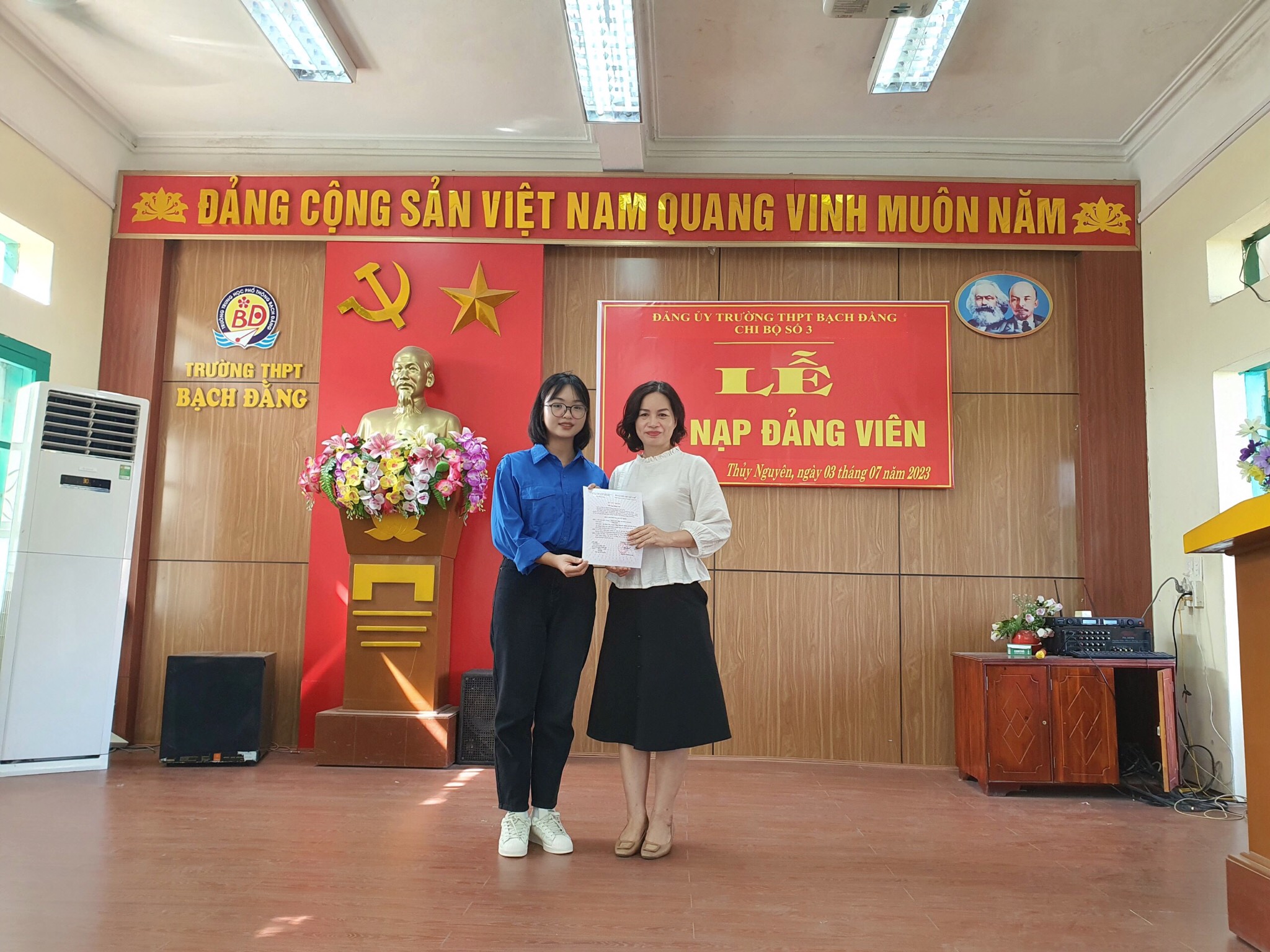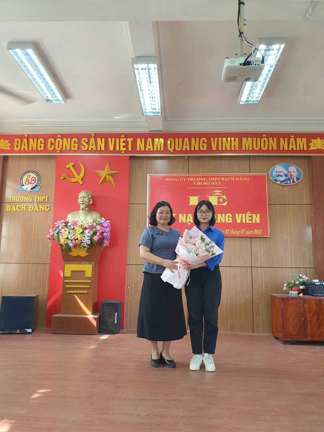Đồng chí Đỗ Thị Thúy Vinh-Bí thư Đảng bộ, Hiệu trưởng nhà trường trao tặng bó hoa chúc mừng đảng viên mới!