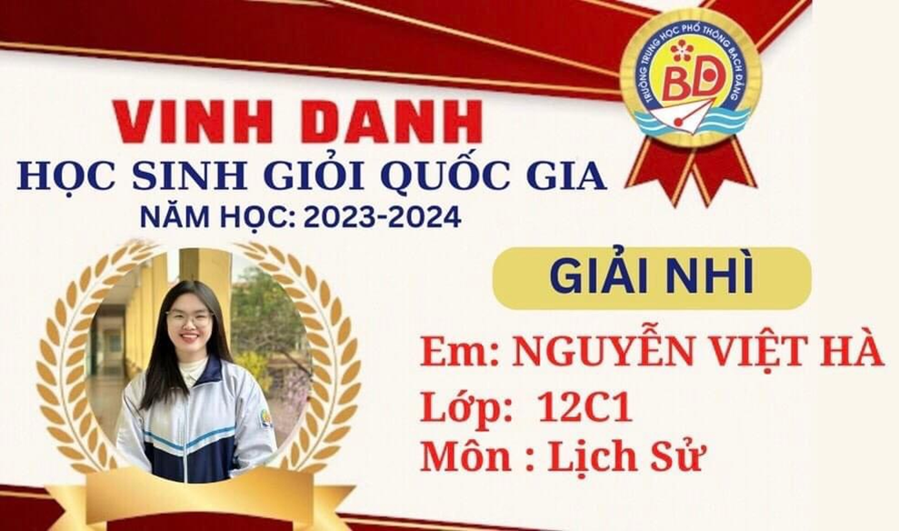 Đam mê Lịch sử vẫn chưa dừng lại ở đây, bởi lẽ ước mơ được phát huy khả năng của bản thân ở những sân chơi mới chưa từng ngơi nghỉ trong trái tim của cô học trò. Xin chúc mừng cho kết quả cao mà Việt Hà đã đạt được trong kì thi chọn HSG Quốc Gia vừa qua. Chúc cho cô bạn sẽ phát huy được thế mạnh của mình để thành công hơn nữa trên con đường học tập! Đây cũng là lần thứ 4 trường THPT Bạch Đằng vinh dự có học sinh giành được giải trong kì thi chọn HSG Quốc Gia năm học 2023-2024, một lần nữa xin chúc mừng Việt Hà đã viết thêm trang vàng thành tích cho nhà trường!