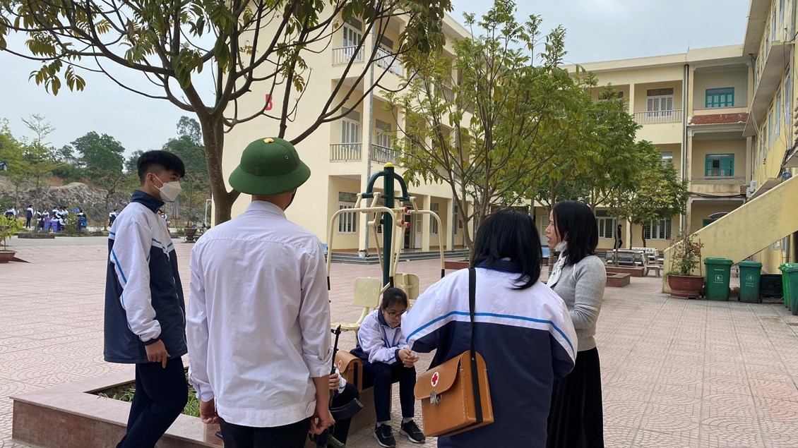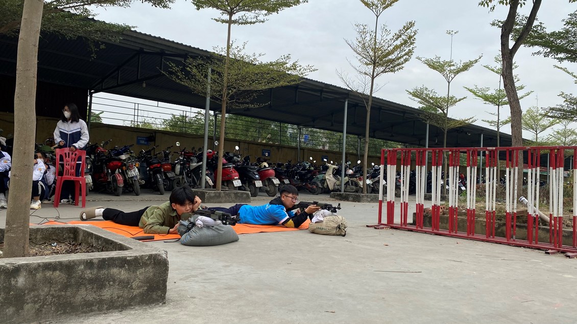 Hình ảnh các thầy cô phụ trách hướng dẫn, kiểm tra các nội dung như: tháo lắp súng, thực hành, kĩ thuật cấp cứu và chuyển thương, bắn súng,..