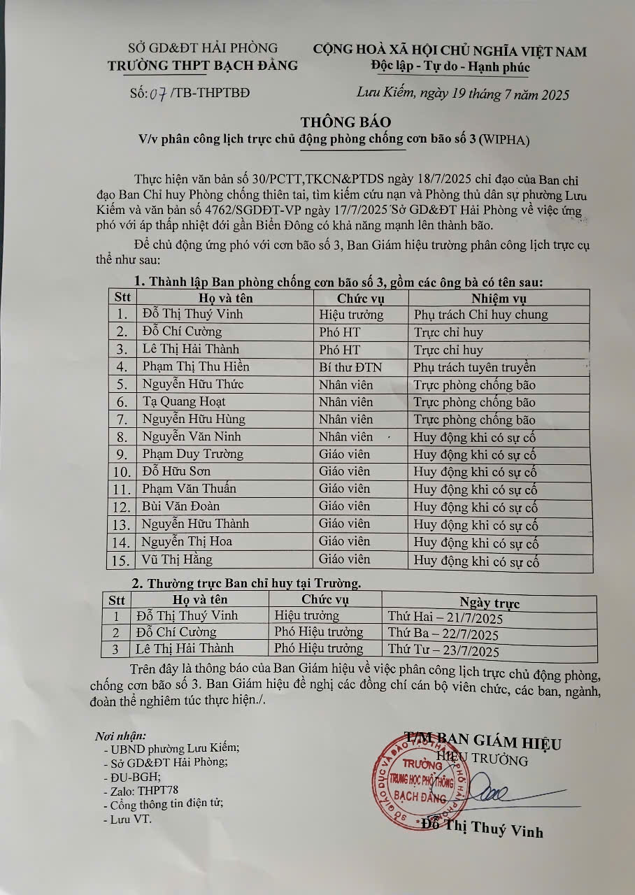 Thực hiện văn bản số 30/PCTT,TKCN&PTDS ngày 18/7/2025 chỉ đạo của Ban chỉ đạo Ban Chỉ huy Phòng chống thiên tai, tìm kiếm cứu nạn và Phòng thủ dân sự phường Lưu Kiếm và văn bản số 4762/SGDĐT-VP ngày 17/7/2025 Sở GD&ĐT Hải Phòng về việc ứng phó với áp thấp nhiệt đới gần Biển Đông có khả năng mạnh lên thành bão. Để chủ động ứng phó với cơn bão số 3, Ban Giám hiệu trường phân công lịch trực cụ thể như sau: