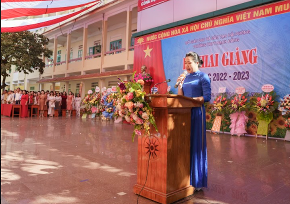 Cô Đỗ Thị Thúy Vinh - Bí thư Đảng bộ, hiệu trưởng nhà trường đã đọc diễn văn Lễ khai giảng và đánh trống khai trường; Tiếng trống