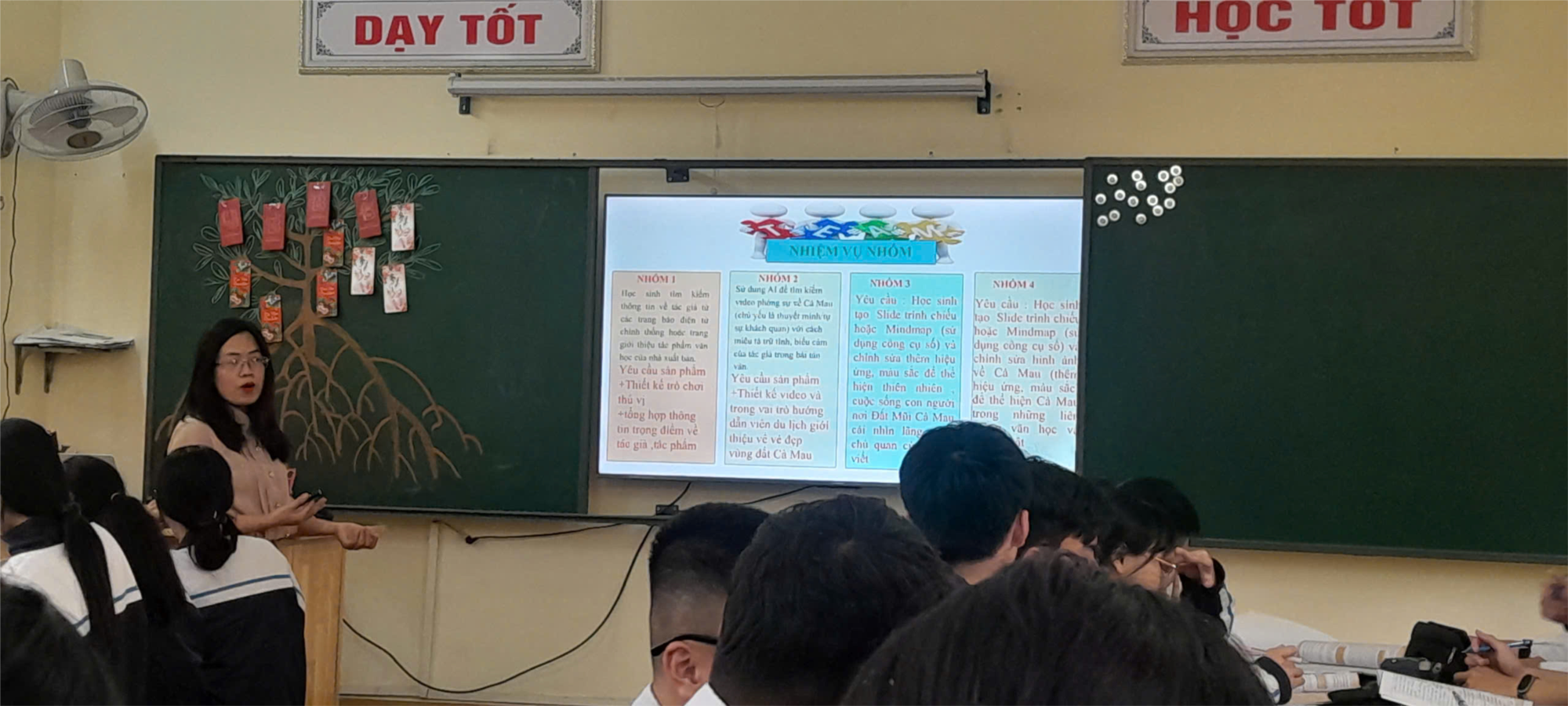 Trong khi đó, tiết học của cô Lưu Thị Kim Chi với văn bản “Trí thông minh nhân tạo” (trích 50 ý tưởng về tương lai của Richard Watson) lại mang đến một góc nhìn hiện đại, gắn với xu thế phát triển của thời đại. Bài giảng được thiết kế theo hướng phát triển năng lực, khuyến khích học sinh tư duy phản biện, trao đổi quan điểm về vai trò và tác động của trí tuệ nhân tạo trong đời sống. Không khí lớp học sôi nổi, học sinh chủ động tham gia, thể hiện rõ tinh thần học tập tích cực và khả năng thích ứng với những vấn đề mang tính thời sự.